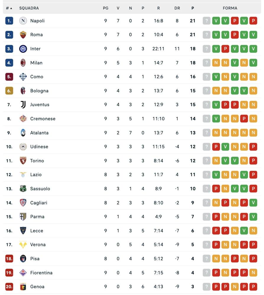 Di seguito la classifica di Serie A aggiornata dopo i match delle 20:45: