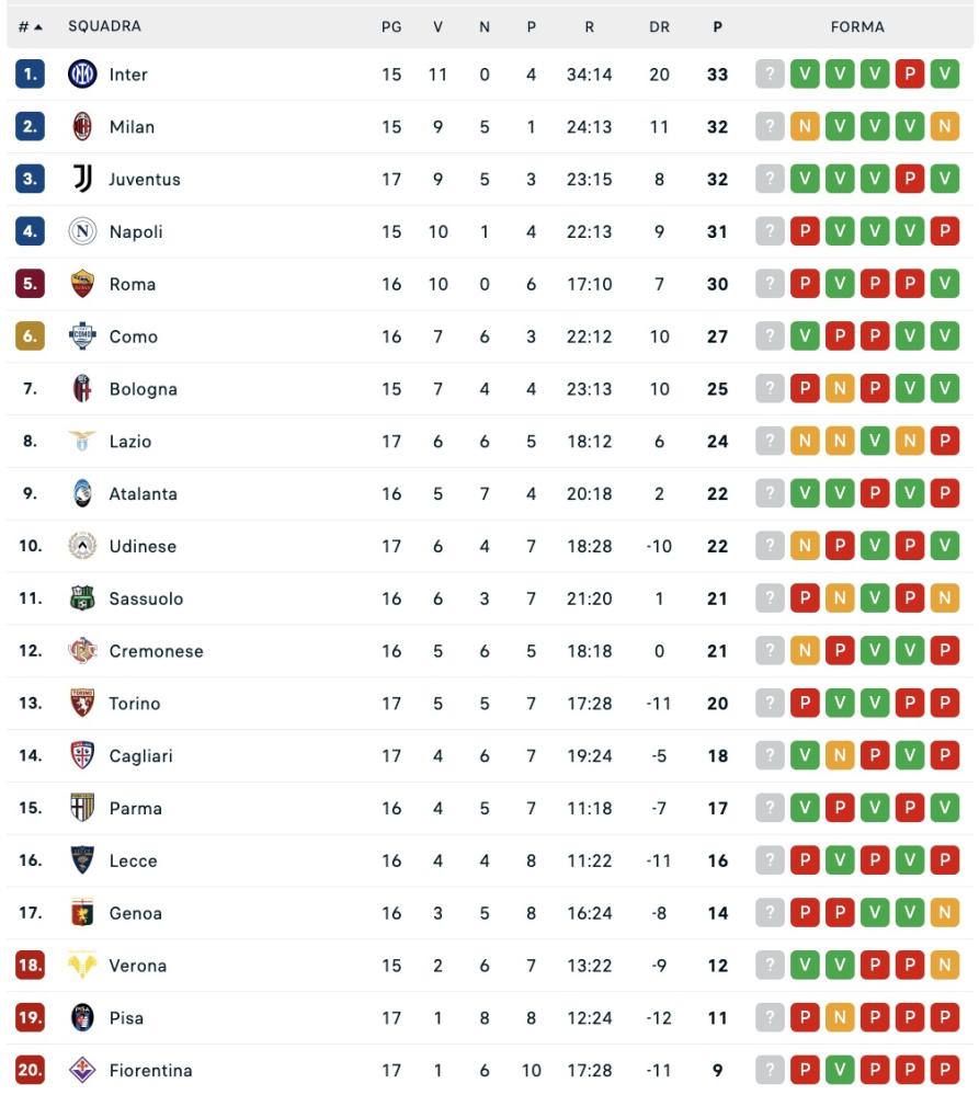 Di seguito la classifica di Serie A aggiornata dopo Pisa-Juventus 0-2: