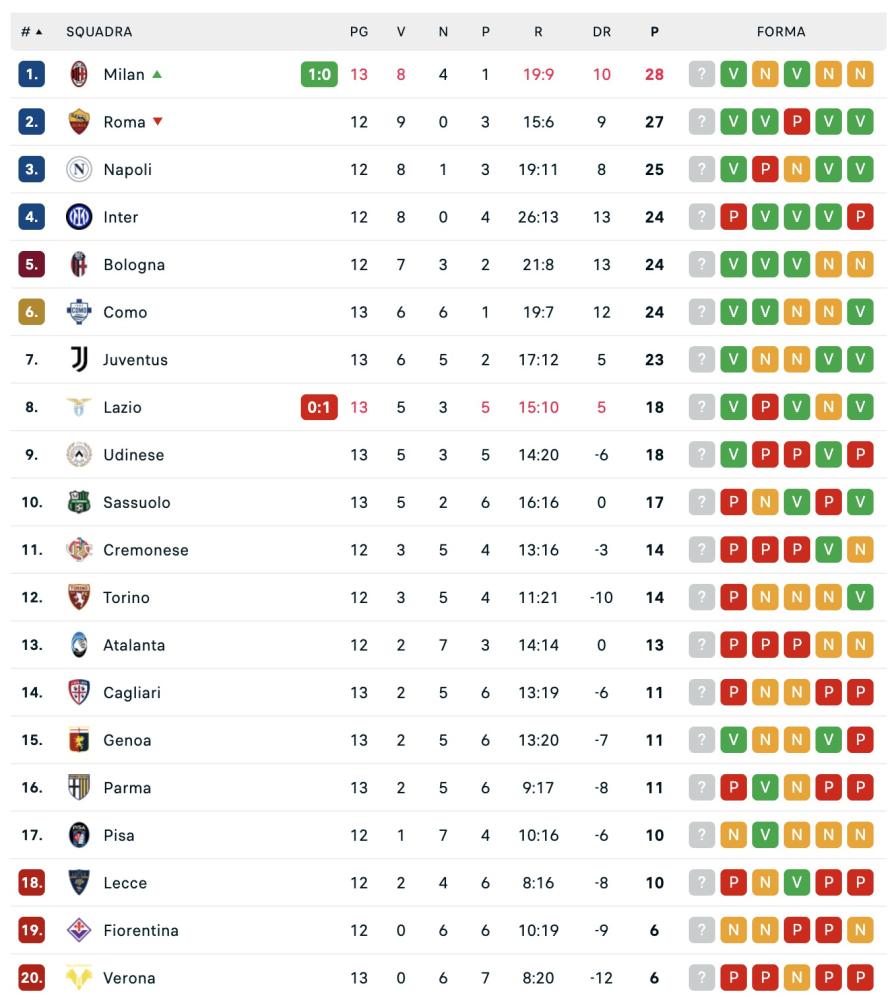 Di seguito la classifica di Serie A aggiornata dopo Milan-Lazio 1-0:
