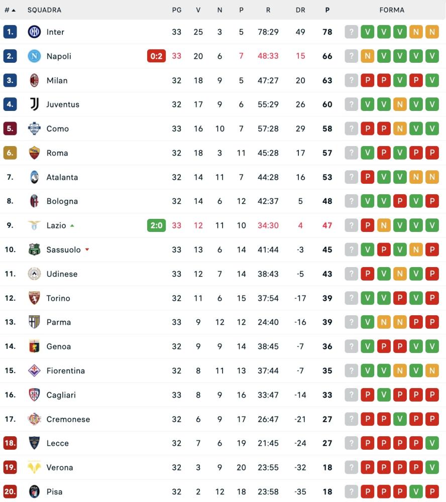 Sconfitta pesantissima del Napoli contro la Lazio: la squadra di Antonio Conte rimane ferma a 66 punti. Il Milan potrebbe agganciare gli azzurri con una vittoria, attenzione poi alla Roma che se battesse l'Atalanta si porterebbe al quinto posto a sole sei lunghezze di distanza.