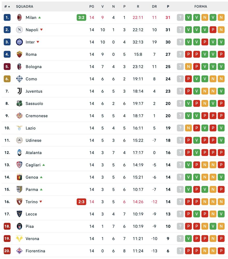 Con i posticipi del lunedì si è chiusa la quattordicesima giornata di Serie A 2025/26. Restano in testa Napoli e Milan, con 31 punti, insegue l'Inter distante di una sola lunghezza, mentre perdono terreno Roma e Juventus rispettivamente a -4 e -8. Rallentano anche le outsider Bologna e Como. Di seguito la classifica di Serie A aggiornata al termine della 14ª giornata: