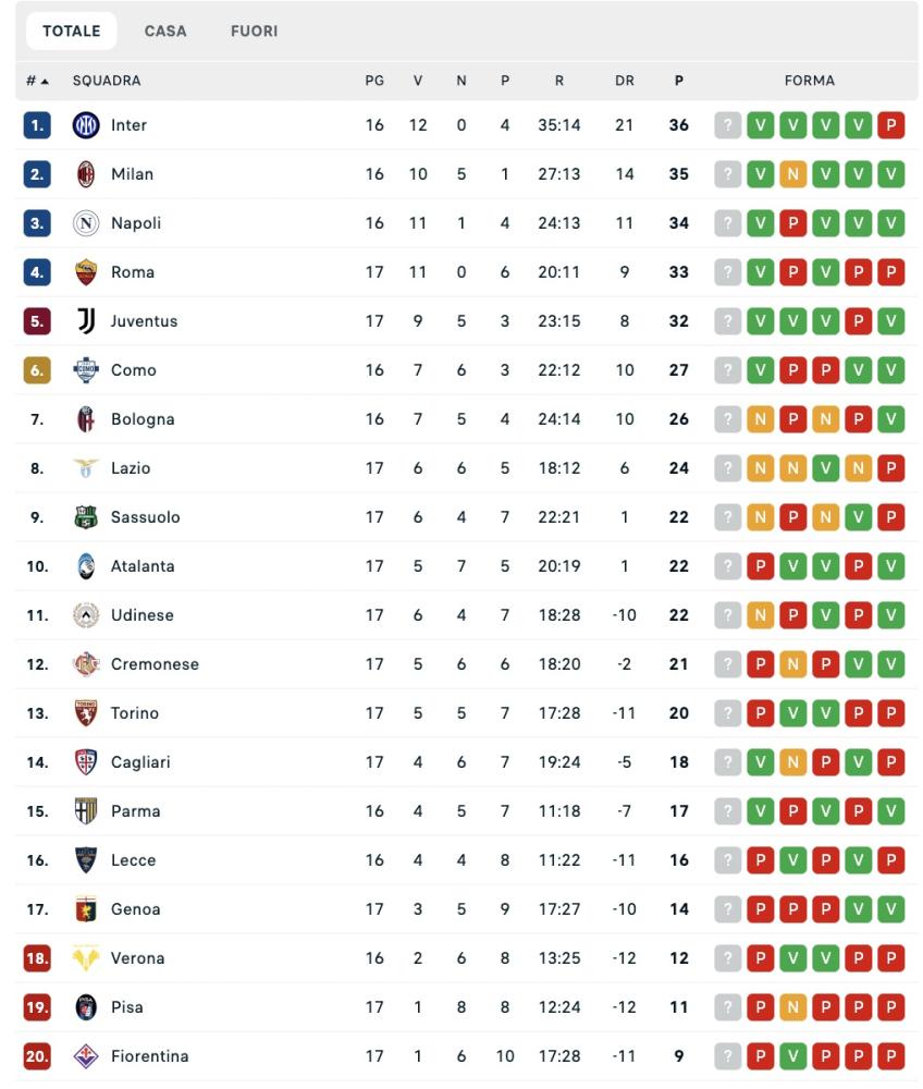 Con Roma-Genoa 3-1 si chiude la 17ª giornata di Serie A. Resta tutto invariato nelle zone alte della classifica dove hanno vinto tutte le prime sei squadre: dunque, Inter ancora in vettta ora a 36 punti, poco più dietro Milan a quota 35 e Napoli a 34, inseguono Roma e Juventus leggermente più in basso e con una gara giocata in più. Resta del tutto aperta anche la lotta Europa tra Como, Bologna e Lazio, mentre fatica a decollare la stagione dell'Atalanta.