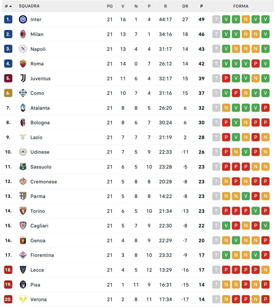 Con i posticipi del lunedì si è chiusa la 21ª giornata di Serie A. La classifica vede le distanze invariate nei primi tre posti: il Napoli resta a -6 punti dall'Inter e a -3 dal Milan; anche la Roma tiene il passo vincendo, mentre la Juventus si ferma e scivola a -4 dagli azzurri prima dello scontro diretto. In zona Europa, il Como viaggia a velocità altissime mentre arrancano Atalanta, Bologna e Lazio.