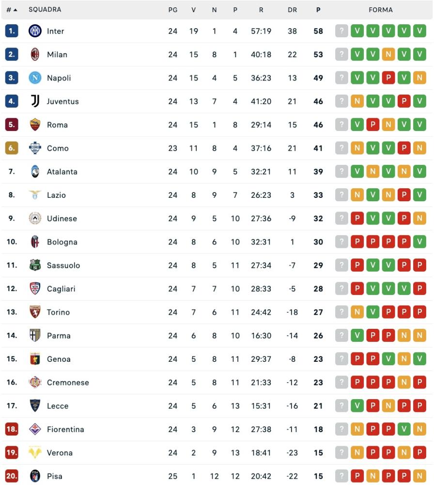 Il Milan vince ancora, seppur con difficoltà contro il Pisa, e si porta a 53 punti in classifica: considerando la gara da recuperare, i rossoneri al momento hanno 24 match giocati come le altre, e ritornano quindi a +4 sul Napoli ed a -5 dall'Inter.