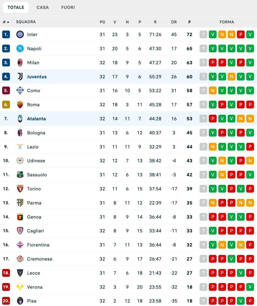 Di seguito la classifica aggiornata di Serie A: